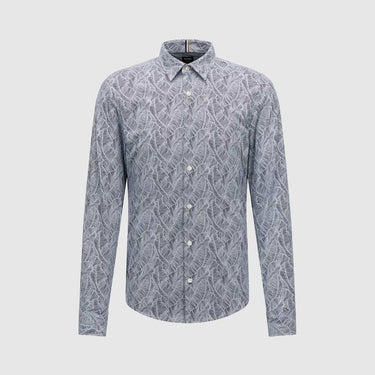 Découvre cette chemise pour homme de chez Hugo Boss, bleu foncé avec des imprimés de feuilles pour lui apporter ce style atypique. Elle contient des boutons pour la fermer ainsi qu'un col montant.