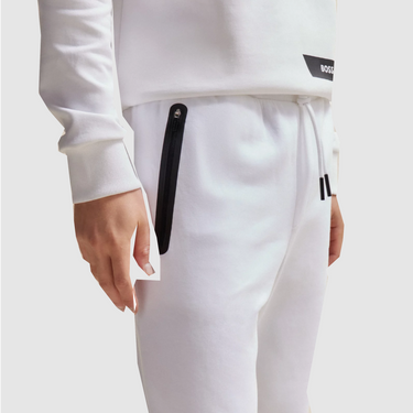 - Description : Découvrez notre bas de survêtement Regular Fit en jersey stretch de couleur blanche avec des revers, des poches zippées collées et une bande graphique griffée BOSS Menswear. Ce produit s'inscrit dans notre engagement en matière de durabilité, avec l'utilisation de plus de 60 % de matières premières durables. Il est fabriqué à partir de coton cultivé en conformité avec les normes de durabilité HUGO BOSS, provenant de sources mettant en œuvre des pratiques de gestion améliorées pour le bien-être des personnes et de l'environnement.