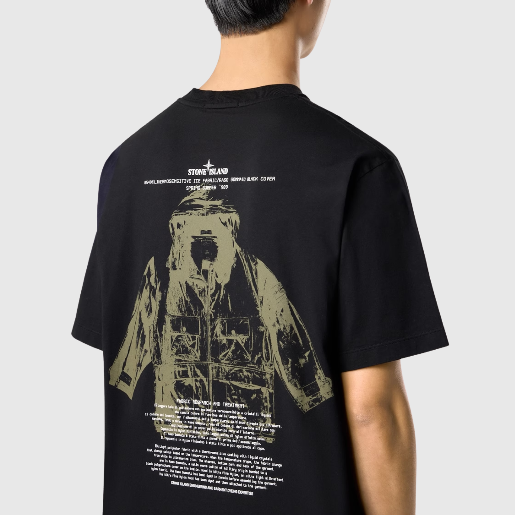 Teint en pièce (garment dyed), ce t-shirt présente des nuances profondes et authentiques, signature du savoir-faire textile Stone Island. Sur la poitrine, le logo Stone Island brodé affirme discrètement l’identité de la marque, tandis que le grand imprimé Archivio au dos rend hommage à la collection Printemps-Été ‘989, apportant une dimension graphique et historique à la pièce.
